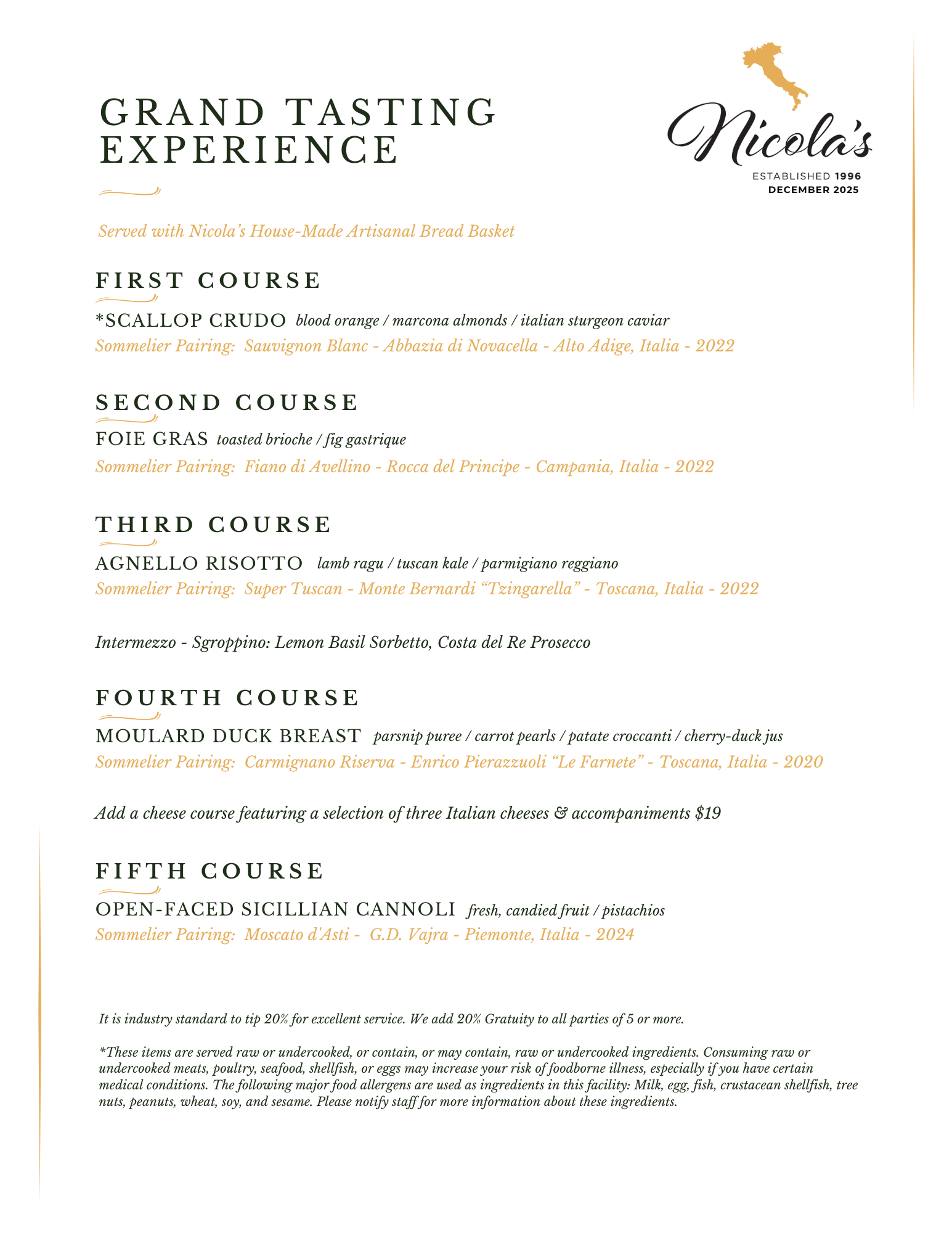 It is industry standard to tip 20% for excellent service. We add 20% Gratuity to all parties of 5 or more. Please inform your server of any allergies.